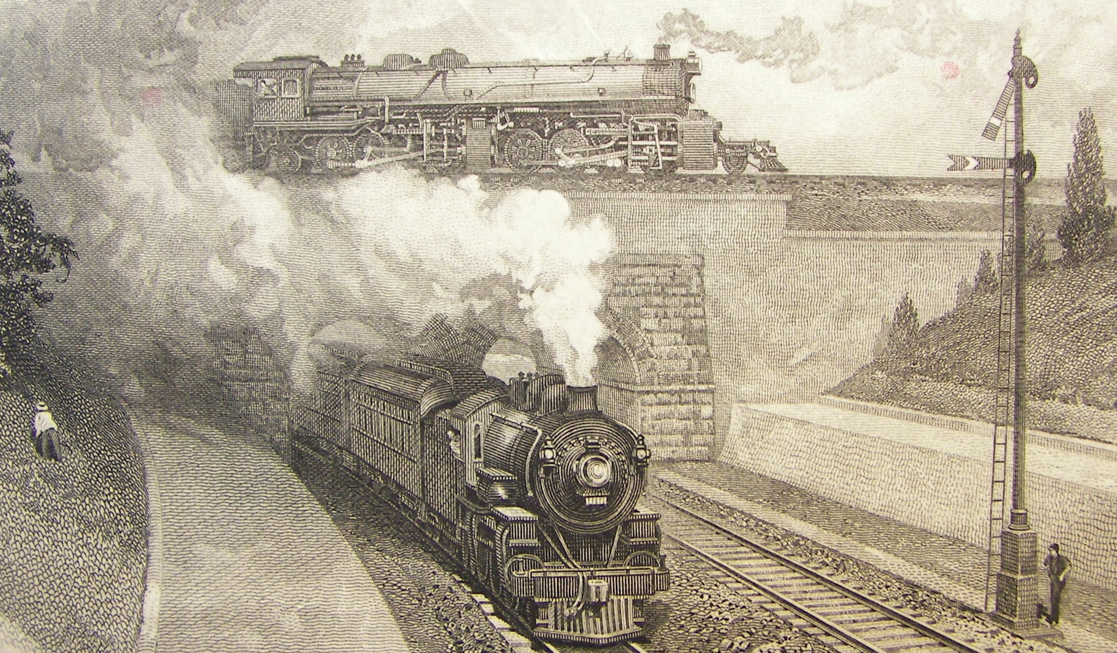 The first two in the next set depict the Pennsylvania Railroad’s Horseshoe Curve. The workers flanking the central scene are a little short of the personal protective equipment required by the Occupational Safety and Health Administration.
