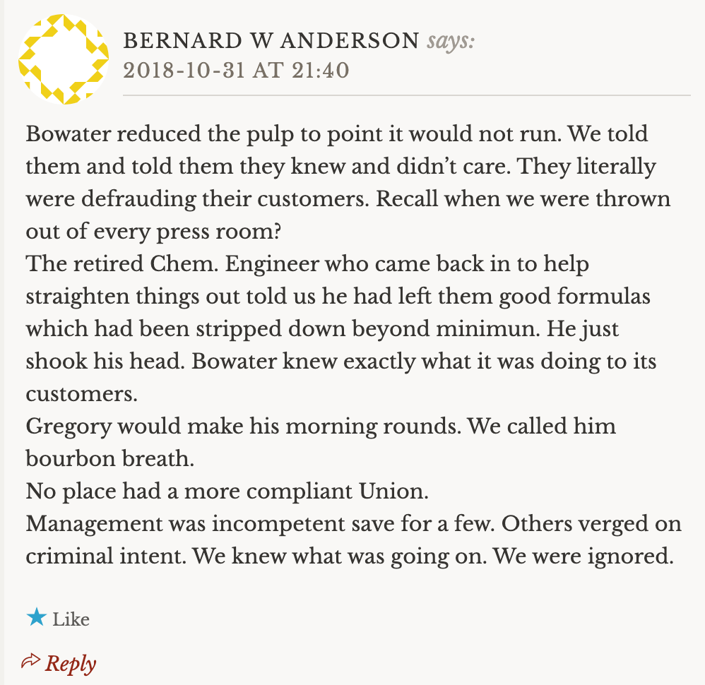 Takeovers. If there’s a factor that did not have as much influence on the demise of Great Northern Paper as is presumed, it would be the corporate takeovers. Great Northern Nekoosa had poured big bucks into the Millinocket mill in 1972 to build #11 paper machine, but ever after almost neglected the Maine mills for the duration of the 1970s and 1980s. Yes, there was money for the Big ‘A’ study and GNN funded the 1985 rebuild of the two large paper machines at East Millinocket, but nothing on the scale of #11 ever came again. GNP simply failed to compete with other GNN projects for capital, in large part due to the influence of non-Maine senior managers and directors such as corporate president Bill Laidig.