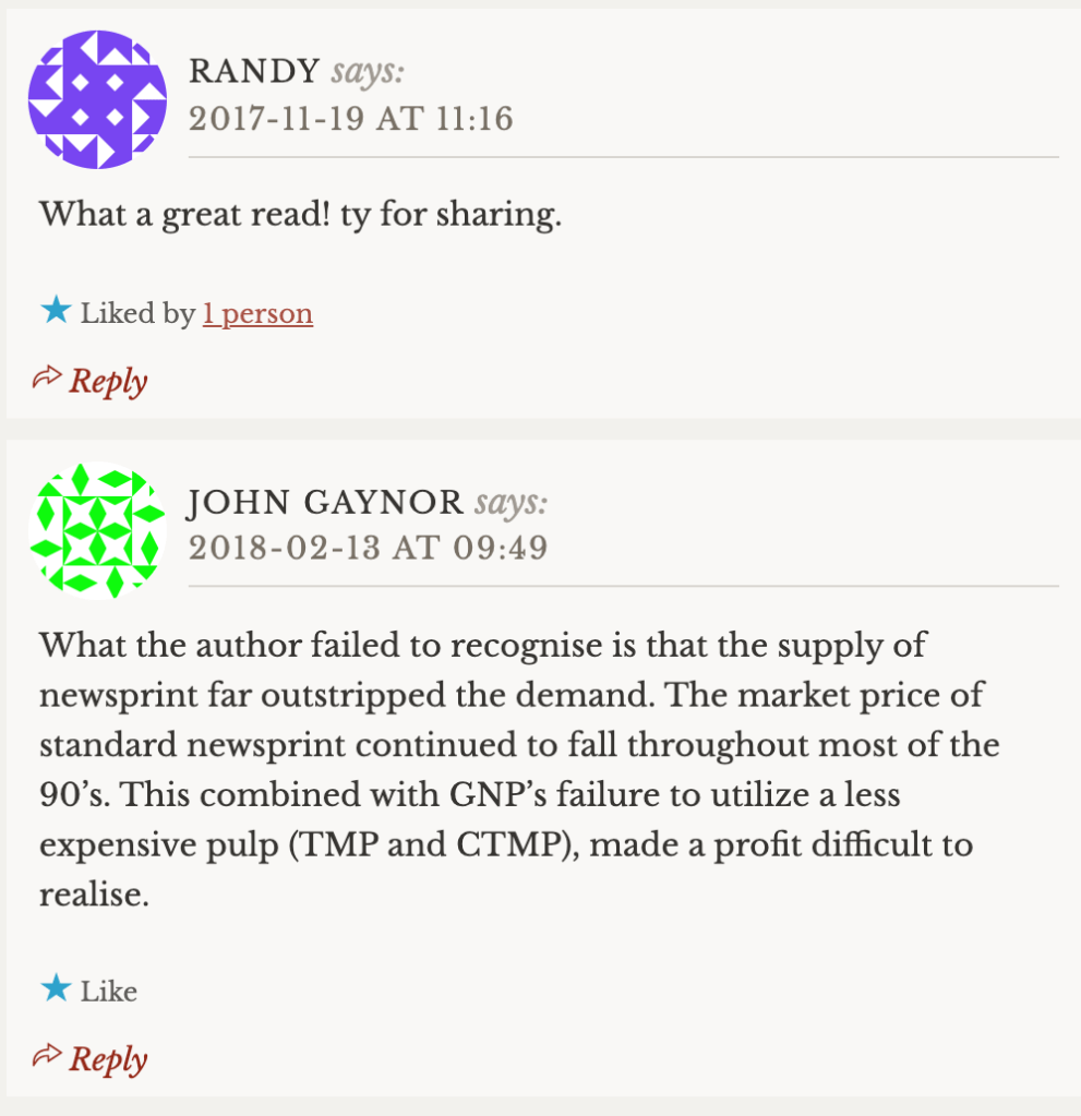 This memoir was written in 2005 essentially from memory, with reference to articles and clippings in my possession at the time. Timber! — a brief chronicle of GNP in the 1970s and 1980s by Paul K. McCann, provided corroboration of some of the facts cited here.