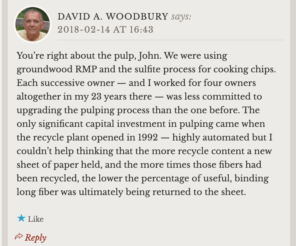 Reductions in force, RIF’s, did shrink the work force to about 2,800 within a year, then further still, until only 1,700 or fewer were left by the time I quit in 1999. Paper machines were shut down and whole “rooms” — spaces within the mills big enough to store a battleship — fell silent. People were laid off, especially as whole departments were shut down. Bumping rights were limited but did permit a junior worker from one department, once RIFfed from that department, to bump into another department. Quite a few capable workers who didn’t want to wait around to see when their RIF would come simply pulled up stakes and went to work in other mills elsewhere. As this happened, ironic as it was, I found myself calling those just laid off to come back to work. Each summer for the next several years, the temporary summer help consisted not of recent high school graduates and college students, as it had been, but those who had recently been “permanently” laid off.