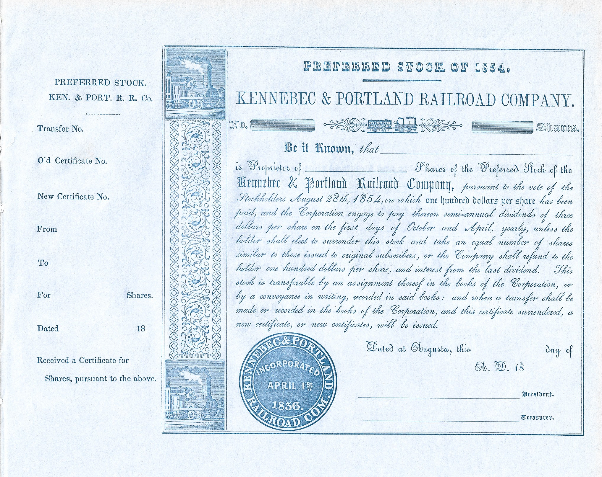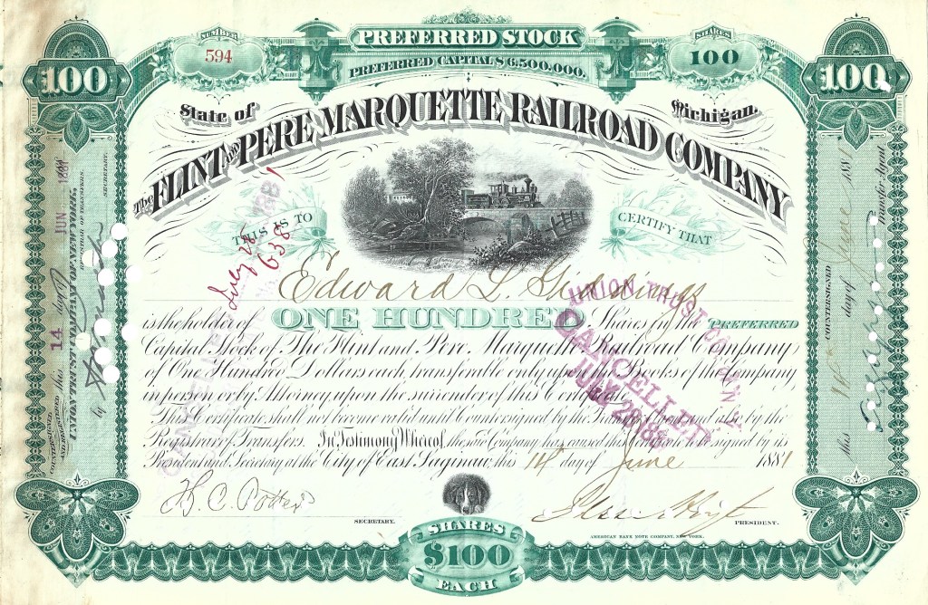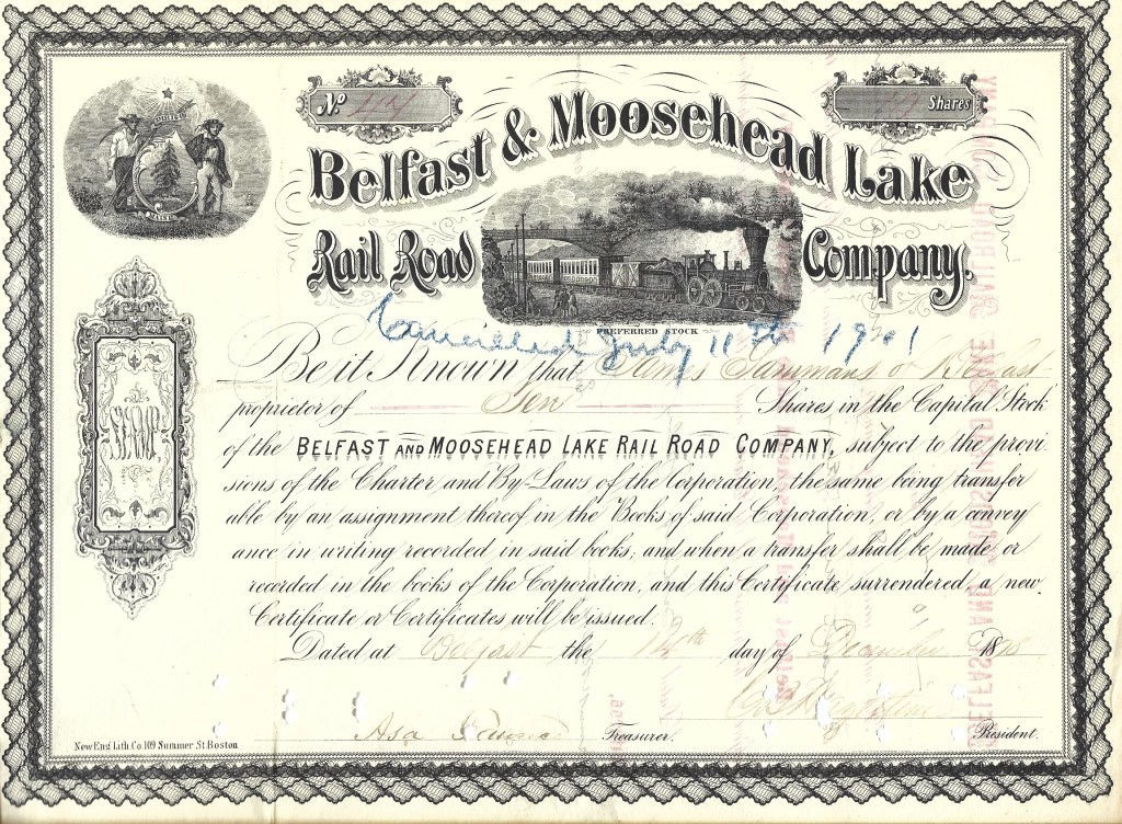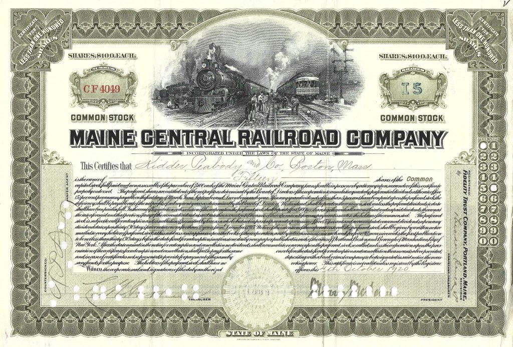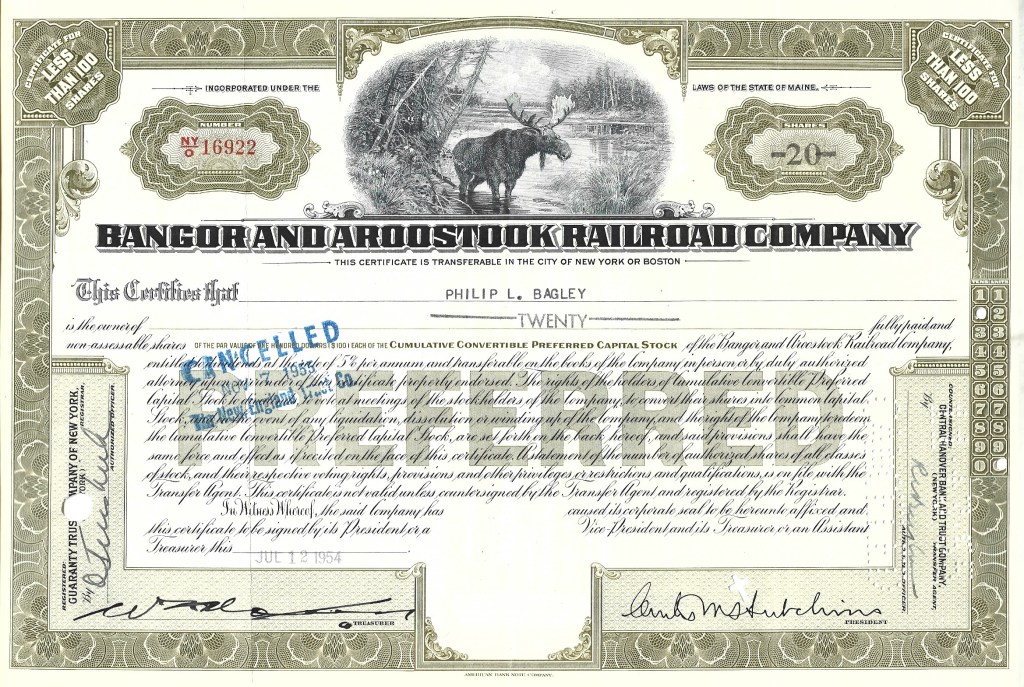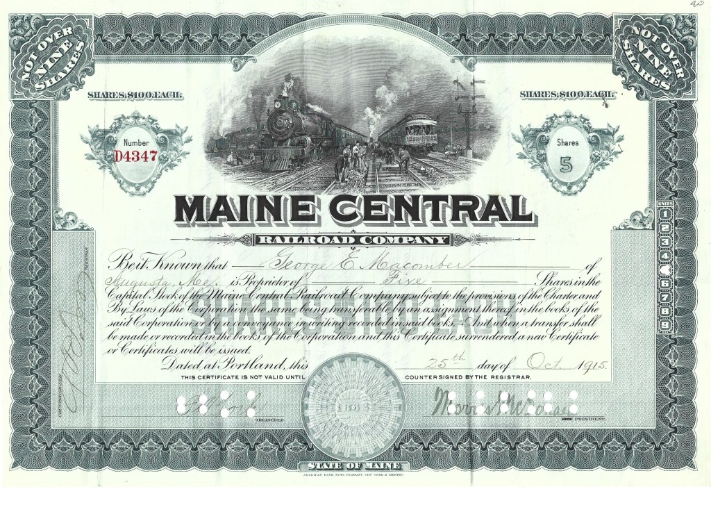 From a private collection, here is a representation of stock certificates from the 1840s to the 1970s. The collection centers around railroads but encompasses other industries as well. All are originals. Some are un-issued, some were issued and subsequently redeemed (cancelled). Most are nearly as interesting on the reverse side as on the obverse although only the obverse is shown here.