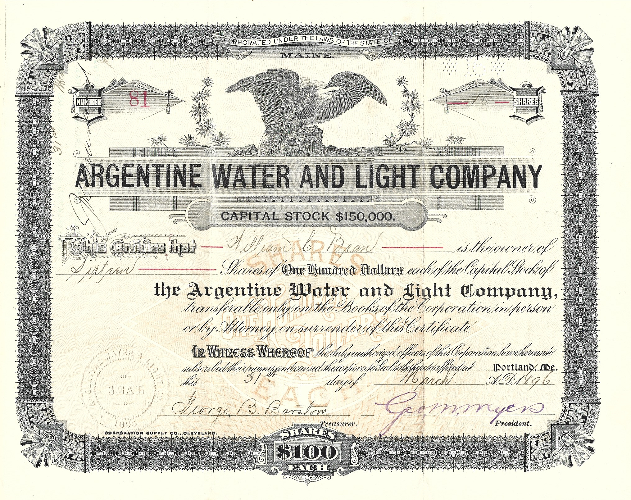 reissue of preceding certificate, issued to W. C. Bean, April 19, 1895 — Note that the two certificates were held together by a straight pin.