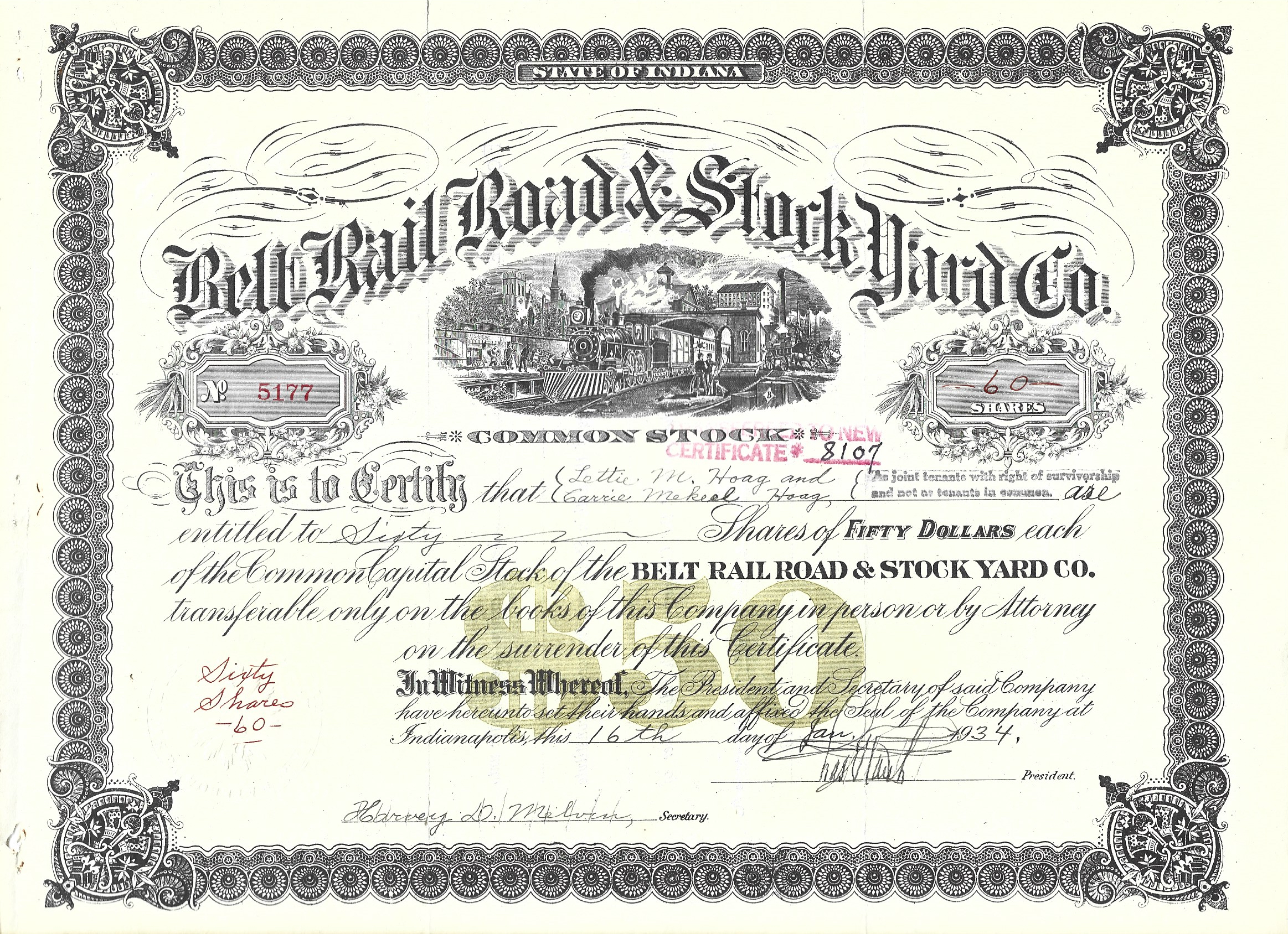 issued in 1934 to Lettie M. Hoag and Carrie Mekeel Hoag “As joint tenants with right of survivorship and not as tenants in common”