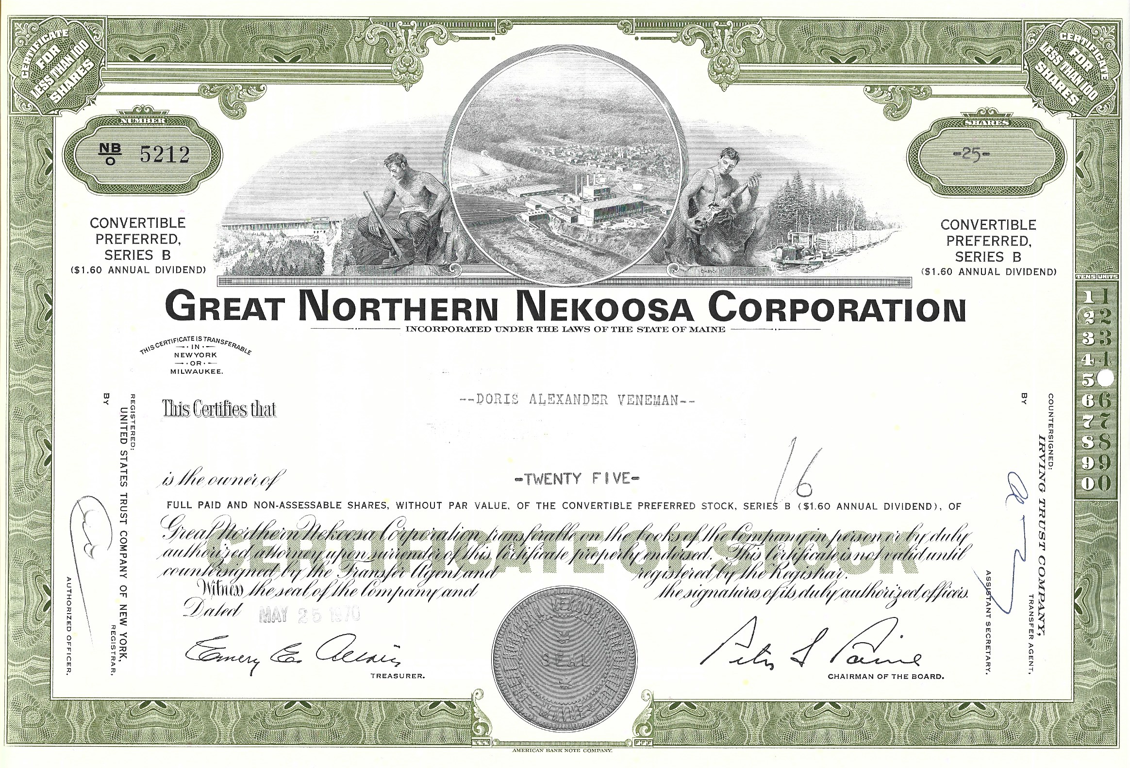 issued to Doris Alexander Veneman in 1970 — Note that Gerald E. Veneman was president of Great Northern Nekoosa Corporation from 1970 – 1985. Doris was his wife. The illustration depicts the paper mill in East Millinocket, Maine.
