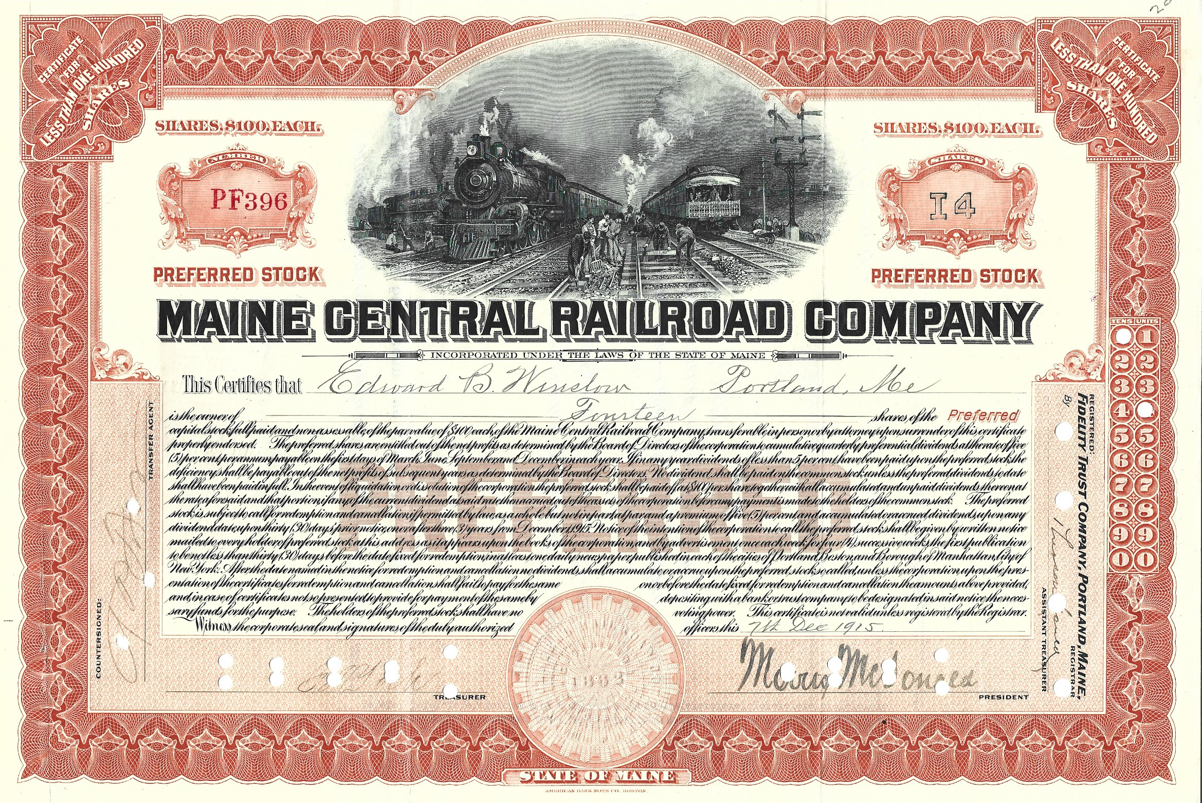issued to Edward B. Winslow in 1915 — Note that this is Preferred Stock while the preceding certificate is not, also same signatures on both documents.