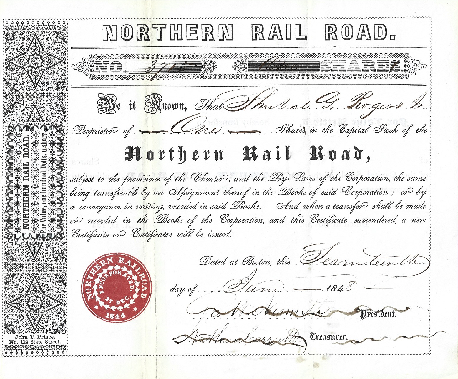 issued to Shubal G. Rogers, Jr., in 1848