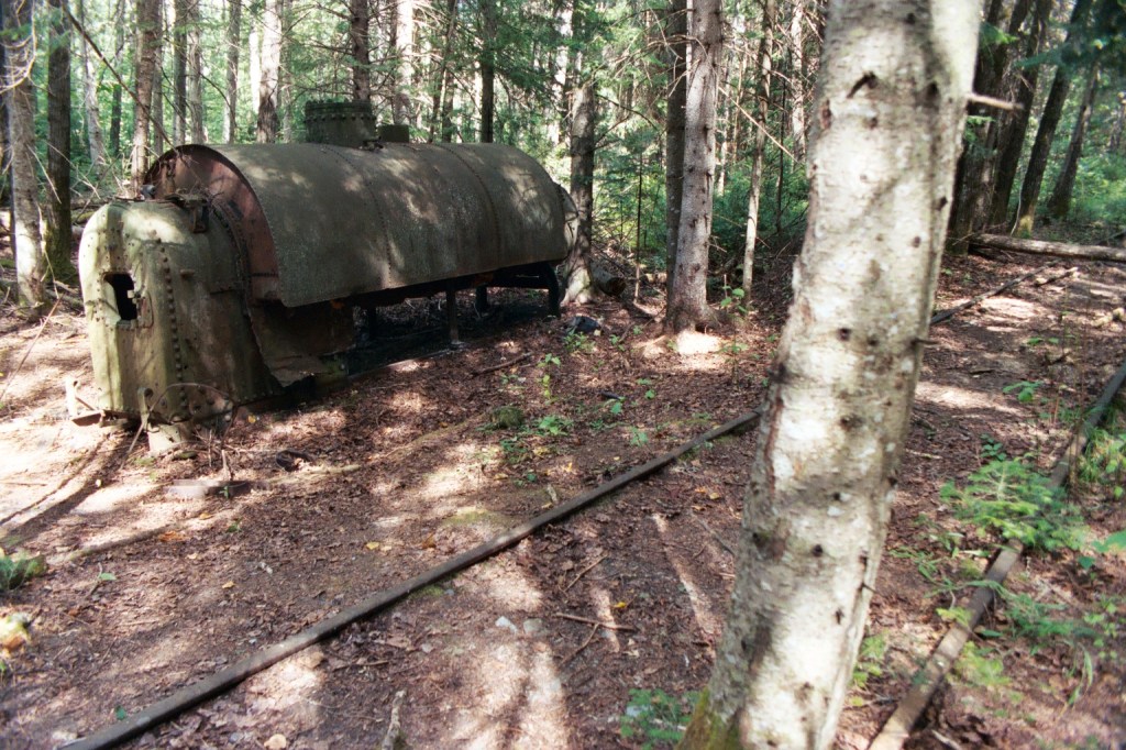 To get to the tramway by way of Chamberlain Lake, you head into a swampy cove, a half mile across at its opening, located on the northeast end of the lake. (Follow the eastern shore into this grassy swampy cove until you come to a barely-discernible landing, which you can guess at because there is a bright clearing on the shore to aim for.) When you come by lake, you will be at the Chamberlain end of the tramway conveyor. There is a pair of standing boilers here, similar to steam locomotive boilers but stationary. A lot of other equipment is located in this clearing, and a team of volunteers has begun to reconstruct the tramway mechanism on this site. From here you would hike the 3000-foot distance to the Eagle Lake on the highway of a trail that I mentioned earlier, to get to the clearing with the locomotives.
