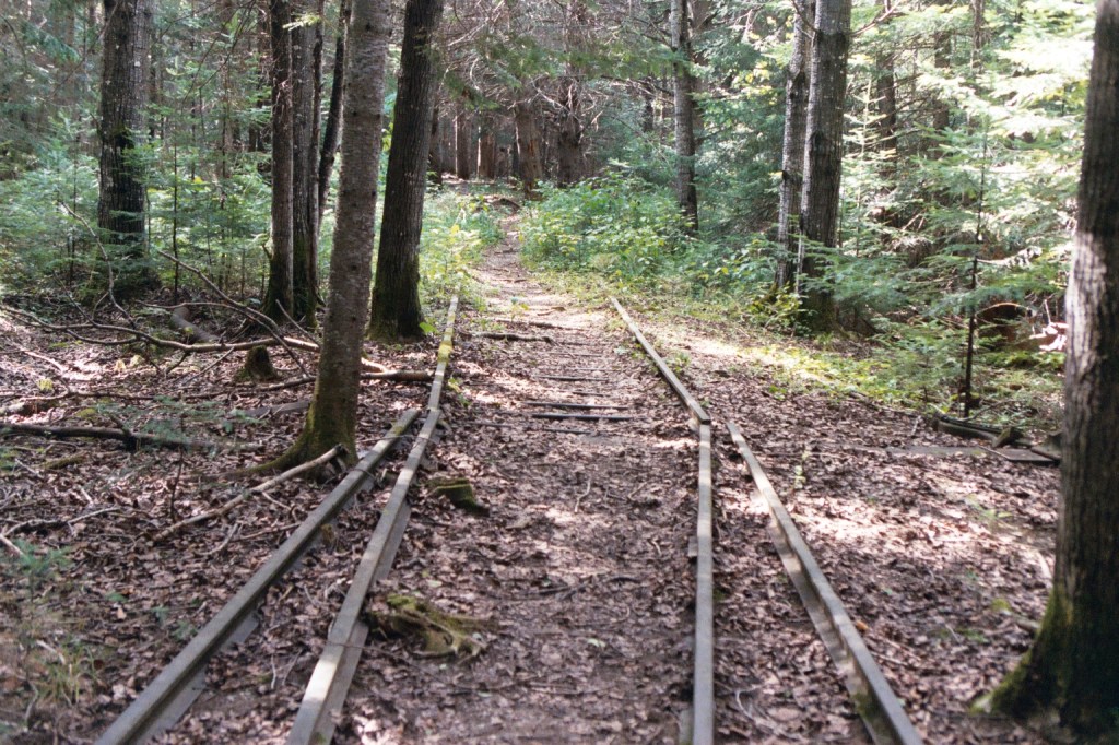 The tramway turned out to be inefficient and inadequate to the task of transporting the quantity of timber that was expected of it. So they abandoned it for a standard-gauge rail line, starting at the same point on Eagle Lake where the tramway began. There is a pleasant highway of a hiking trail alongside the remains of the tramway, which is the word often but misleadingly used to refer to the whole place where the locomotives and all the relics now lie. So it is just over a half-mile hike to reach the other end of the tramway at Chamberlain Lake, well worth the time to see the equipment (and restoration under way) there.