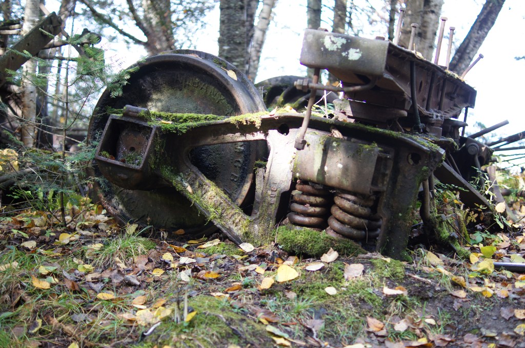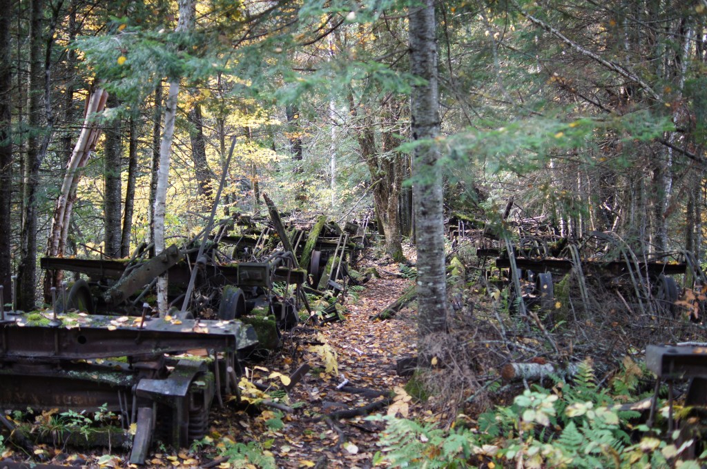 There are some historical placards on the locomotives and among the relics explaining that this whole operation was built in the 1920s (and abandoned in the 1930s) so that logs which had been cut to the east of Eagle Lake could be floated across that lake to the dug channel next to the locomotives. Once the railroad made the tramway obsolete the railroad delivered them by log car the 13 miles to Umbazooksus Lake. At Umbazooksus they were dropped into Umbazooksus stream, which is really the northern tip of Chesuncook Lake. Ripogenus Lake is the southern half of the same body of water. Logs could then drop alongside Ripogenus Dam into the beginning of the West Branch of the Penobscot River. Log drives like this, though, ceased in the early 1970s and that’s when the Golden Road was extended to the border with Canada to the west and into the Allagash region to the north.