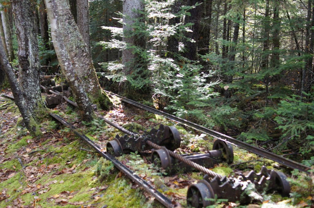 The tramway consists of a 6000-foot loop of steel cable (still there) which runs from Eagle Lake to Chamberlain Lake, a span of 3000 feet, which was towed by a pair of stationary boilers at the Chamberlain Lake. Small sets of wheels rode a pair of miniature rails (tiny compared to a standard-gauge railroad) and long logs were dragged from the shore of one lake to the shore of the other on these little wheels.