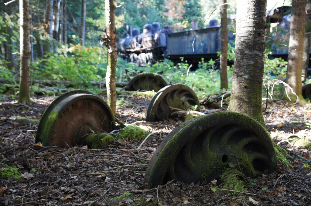 From the crossing, continue about another 10 miles on Grande Marche Road, keeping to the right when presented with an unclear choice, until you cross a short bridge over Allagash Stream. Within a mile or so, on the right, there will be two lesser roads. Skip the first, less-passable one and take the second, which is in better condition (First Right under ‘Coordinates’). Note, however, that since 2017 there has been work under way to open a new way in to the locomotives using the first of these two lesser roads.