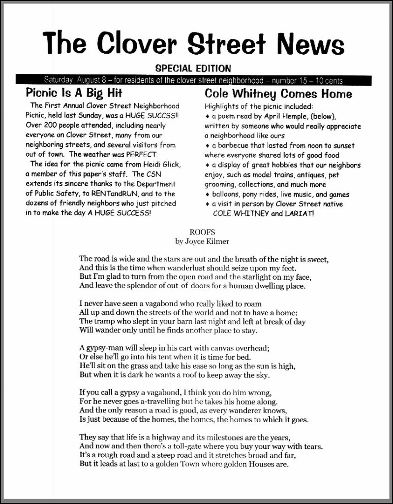 The book’s cover depicts what Clover Street might have looked like from one end of the street. The modern-day cowboy, the baby buggy, and the — uh — large-scale rodent each, by turns, make appearances in the story.